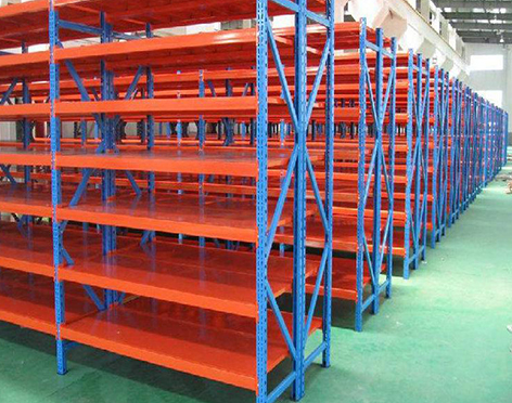 货架由立柱、横梁、横撑、斜撑以及层板组合而成,尼龙自锁螺栓有效防 止螺栓松动后引发货架失稳,立柱冲有双排菱型孔,同时,由于使用横梁形 式,其层高可50mm调整,增加存储的灵活性。层板可由钢层板、木层板及钢 网等构成,层板铺设在横梁之间,具有极大的承重量,充分节省空间,适合小 批量、多品种、小物品存放及人工储存。
